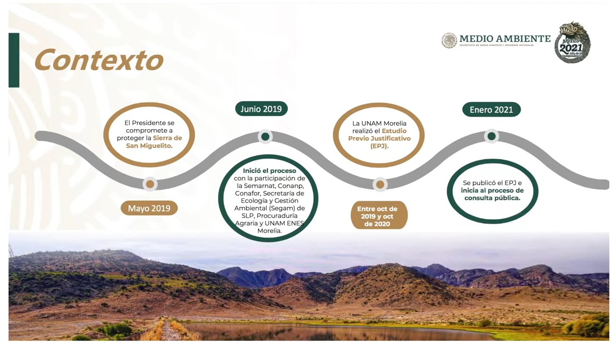 El presidente Andrés Manuel López Obrador anunció que la declaración de la Sierra de San Miguelito como Área Natural Protegida (ANP) incluirá la implementación de la iniciativa de reforestación Sembrando Vida, lo que beneficiará a campesinos habitantes de 35 ejidos y dos comunidades ubicados en las 111 mil hectáreas de territorio.