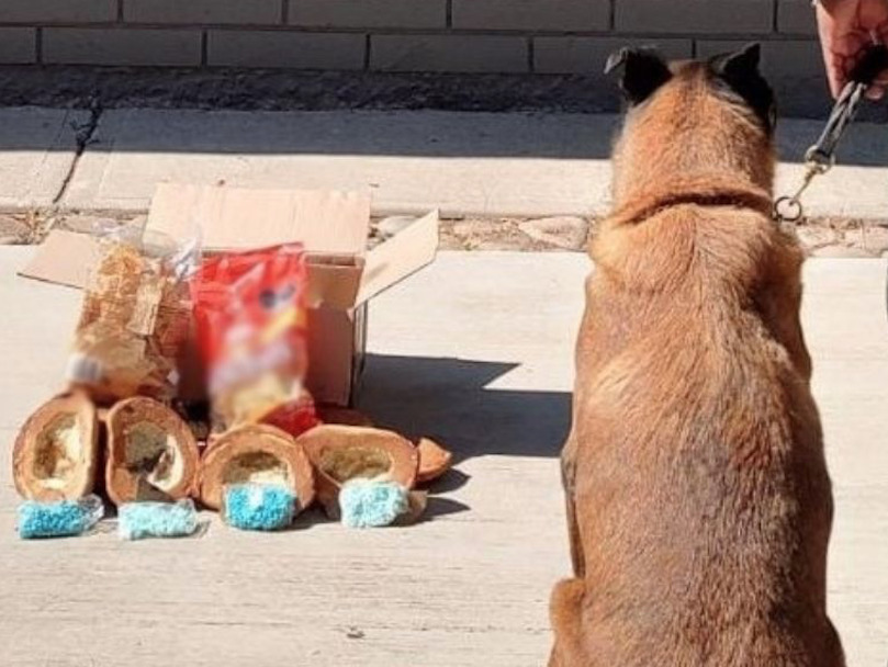 El nerviosismo y la insistencia de los caninos en los paquetes, alertó a los guardias nacionales que procedieron a llevar a cabo una inspección más minuciosa y localizaron en el interior del envío dos bolsas con tortillas fritas conocidas como totopos, así como un paquete de pan casero relleno con pastillas de aparente fentanilo color azul.
