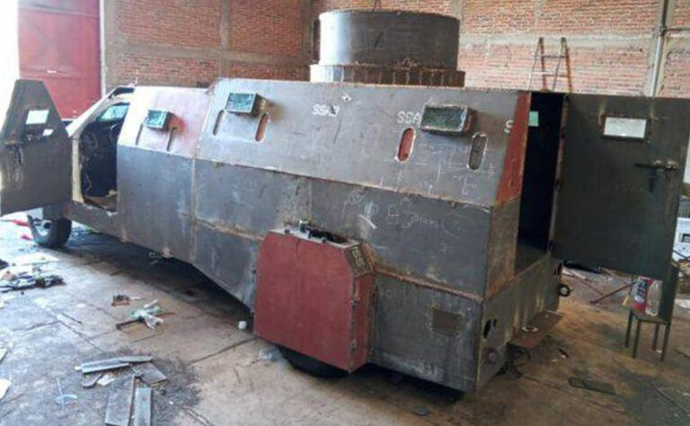 Así que tras el cateo del inmueble se encontraron cinco vehículos, entre los que se encontraba uno con blindaje artesanal. También, había cinco armas largas con chapa de oro y otra pistola.