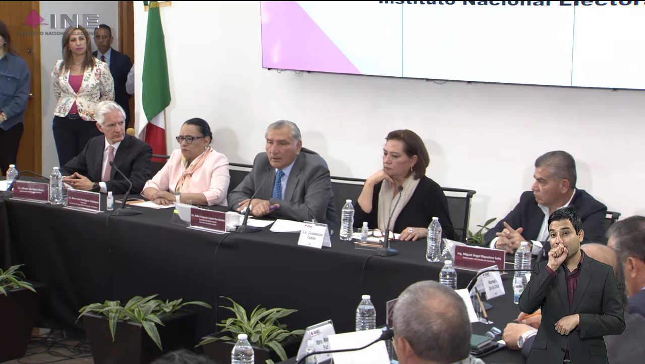 El Consejo General del INE inició la reunión con el secretario de Gobernación, la secretaria de Seguridad y Protección Ciudadana, Rosa Icela Rodríguez, así como con los gobernadores del Estado de México, Alfredo Del Mazo y de Coahuila, Miguel Ángel Riquelme y el titular de la Fepade, José Agustín Ortiz Pinchetti.