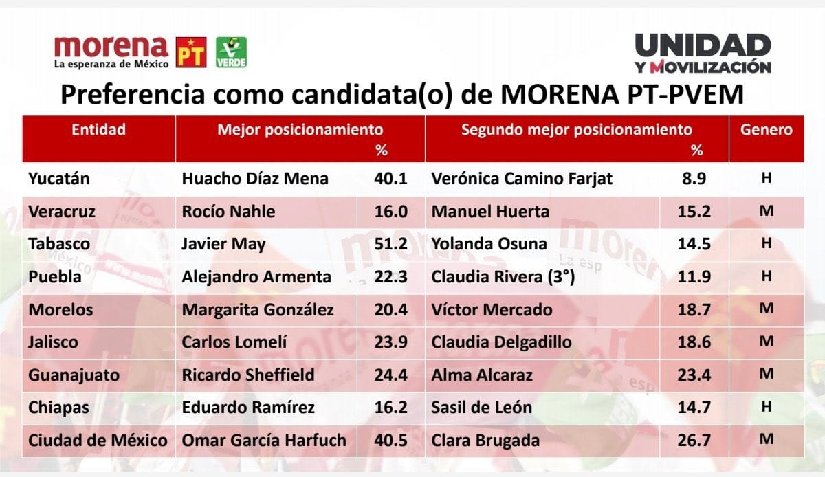 Rocío Nahle, exsecretaria de Energía y Margarita González, extitular de la Lotería Nacional son las únicas dos que ganaron encuesta y su pase fue inmediato por las candidaturas; la primera a Veracruz y la segunda a Morelos. Pero el Instituto Nacional Electoral (INE) había pedido cinco mujeres y cuatro hombres en las nominaciones de las nueve entidades por lo que Alma Alcaraz queda por Guanajuato y Claudia Delgadillo por Jalisco. Los hombres cuatro hombres son Javier May por Tabasco, Alejandro Armenta por Puebla, Eduardo Ramírez por Chiapas y “Huacho” Díaz por Yucatán.