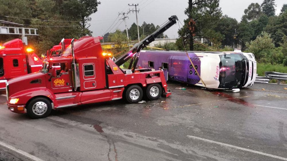 Deja 13 muertos y 28 heridos la volcadura de un autobús en la México-Toluca. Luego de perder el control, un autobús se volcó en la carretera México-Toluca, dejando al menos 13 muertos y 28 heridos. El accidente ocurrió cerca de las 2:30 horas de esta madrugada justo en una curva conocida como La Escondida.