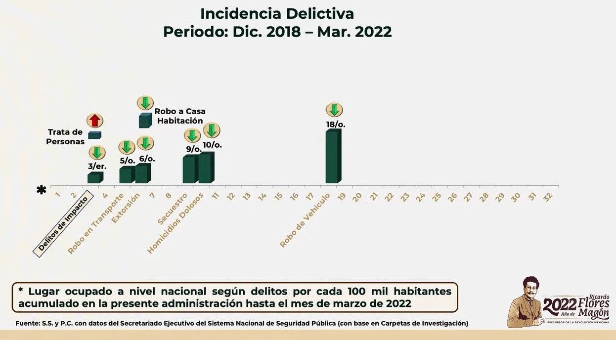 “En cuanto a incidencia delictiva (…) en homicidios dolosos, 47 homicidios en marzo, su tendencia también se identifica hacia la baja con un décimo lugar a nivel nacional”.