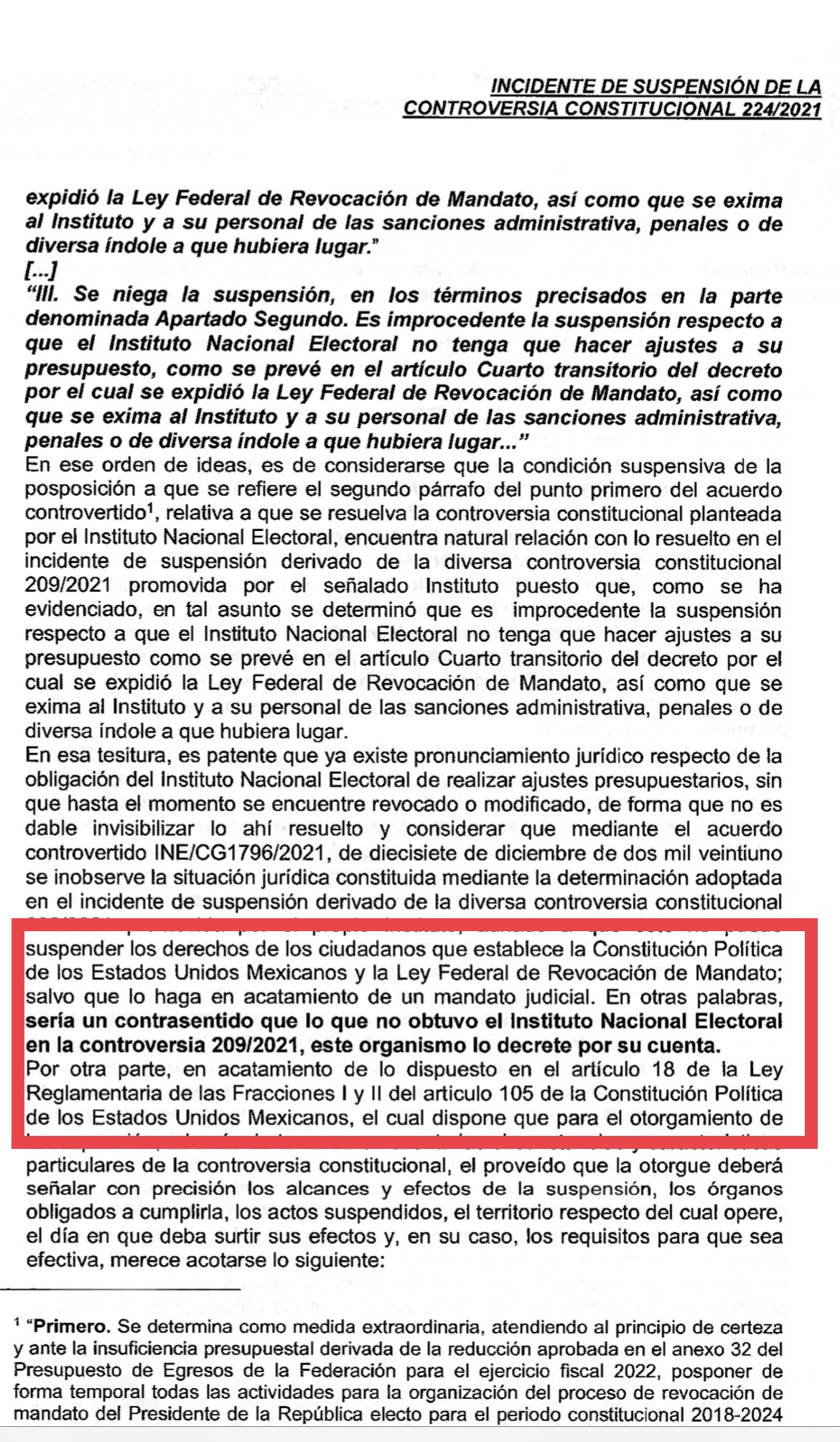 Sin embargo, la Suprema Corte de Justicia de la Nación (SCJN) ordenó al INE continuar con los trabajos programados rumbo a la consulta de Revocación, al admitir a trámite la controversia constitucional interpuesta por la Cámara de Diputados. Días más tarde, admitió también la impugnación de la Consejería.