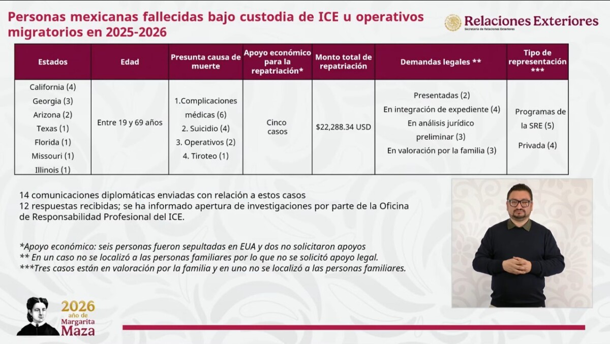 El subsecretario para América del Norte de la Secretaría de Relaciones Exteriores (SRE), Roberto Velasco Álvarez, informó que el Gobierno de México ha enviado 14 comunicaciones diplomática al Gobierno de Estados Unidos, por el fallecimiento de 13 mexicanos durante operativos migratorios o bajo custodia migratoria entre 2025 y 2026, lo cual es un tema doloroso, desgarrador y inaceptable para el Gobierno de México.
