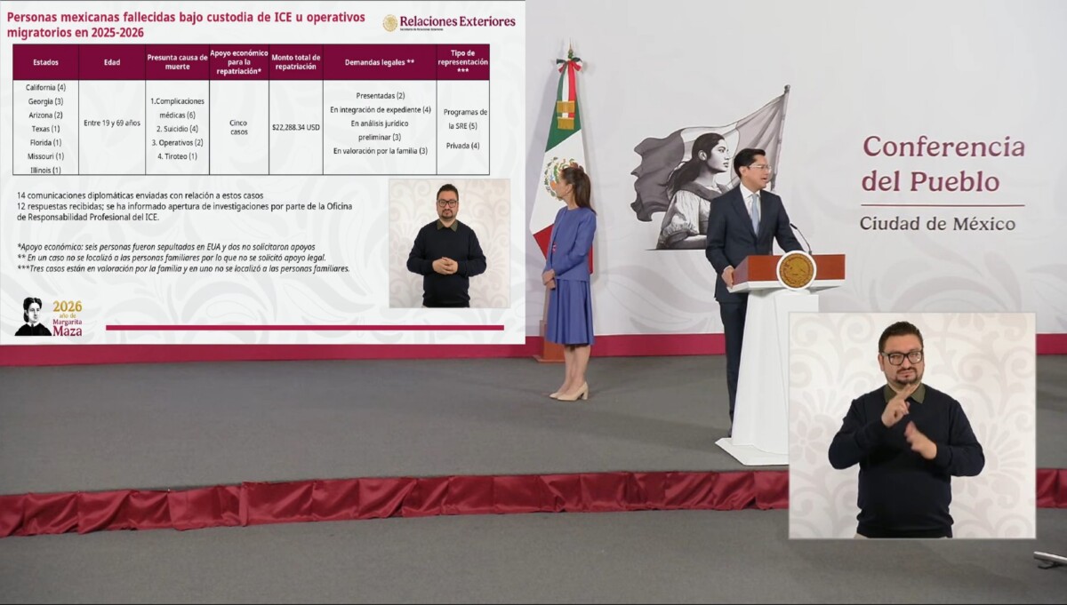 El subsecretario para América del Norte de la Secretaría de Relaciones Exteriores (SRE), Roberto Velasco Álvarez, informó que el Gobierno de México ha enviado 14 comunicaciones diplomática al Gobierno de Estados Unidos, por el fallecimiento de 13 mexicanos durante operativos migratorios o bajo custodia migratoria entre 2025 y 2026, lo cual es un tema doloroso, desgarrador y inaceptable para el Gobierno de México.