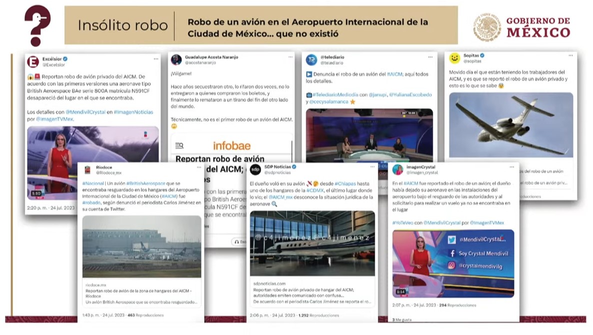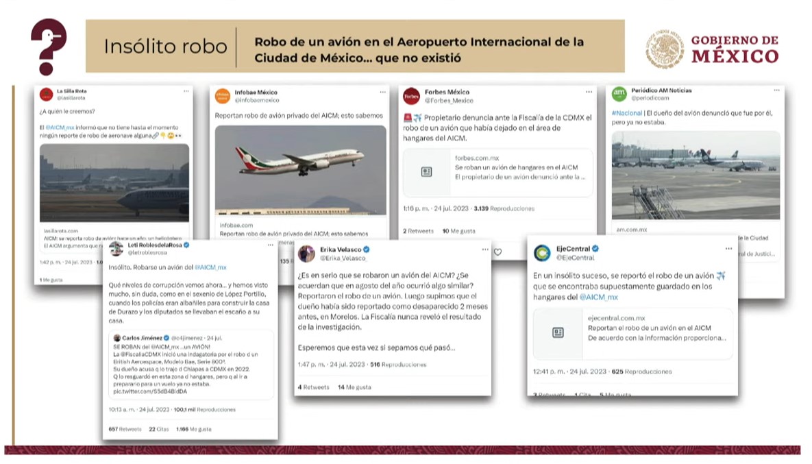 “Es como lo del(supuesto) robo del avión (en el Aeropuerto Internacional de la ciudad de México). ¡Imagínense eso! Ni que viviéramos en el tiempo del narco-Estado de (Felipe) Calderón y (Genaro) García Luna (…) pero todos: ‘Es el colmo, ya se roban un avión del aeropuerto de la Ciudad de México’, y masiva la difusión, y resulta falso”.