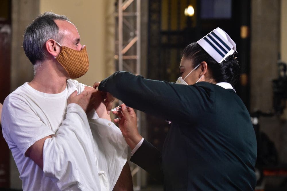 Por ejemplo, un usuario de Facebook publicó la fotografía del subsecretario portando un cubrebocas color mostaza y levantándose la manga izquierda, mientras una enfermera lo inocula.