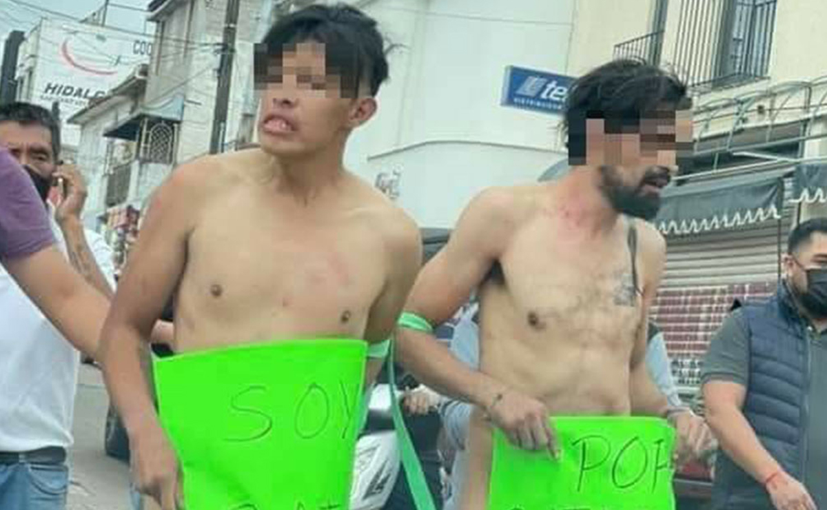 Luego de detenerlos, los desnudaron y les colocaron cartulinas con los mensajes “Soy ratero” y “Por ratero me tratan así”.