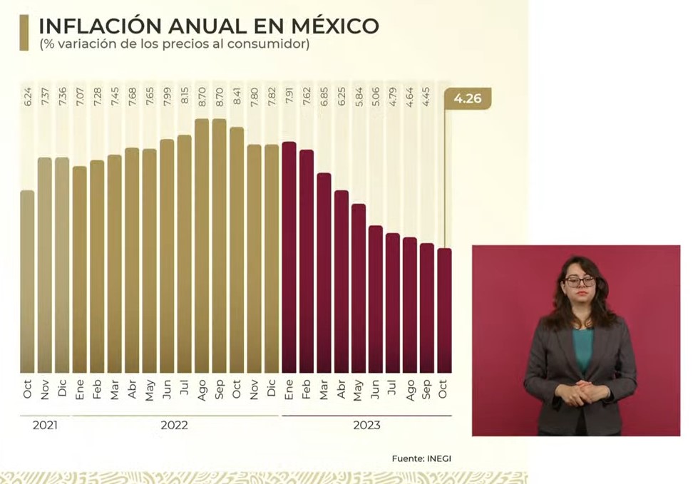 El mandatario destacó la tendencia a la baja de la inflación anual en México, que se ubicó en 4.26 por ciento durante octubre de este año. En el mismo periodo de 2022 se encontraba en 8.41 por ciento.