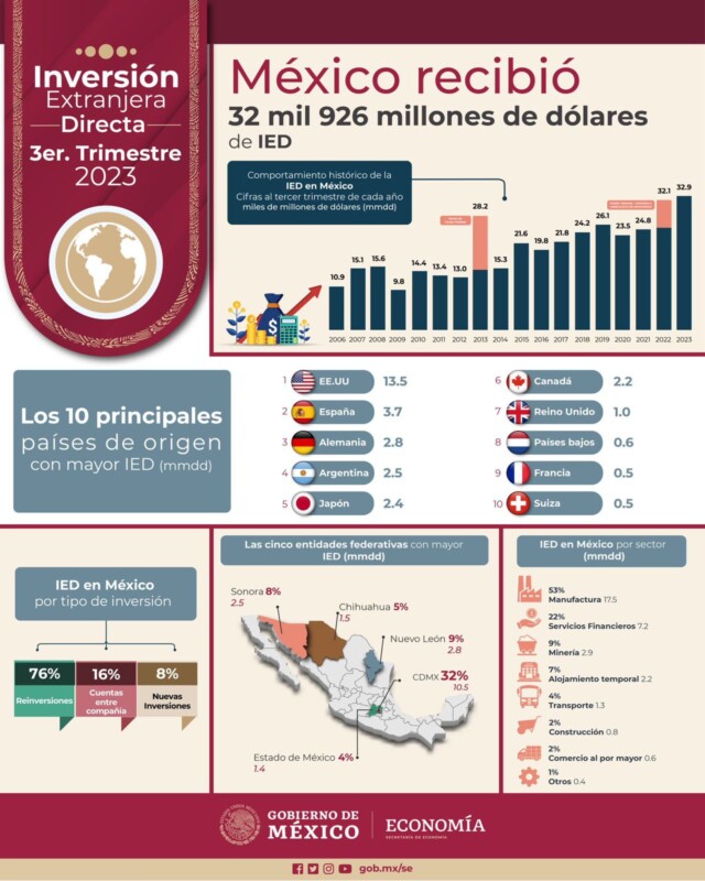 Durante 2023, la IED registrada en México refrendó a Estados Unidos como su principal socio comercial con 13 mil 500 millones de dólares, equivalentes al 41 por ciento de la IED que recibió el país en los tres primeros trimestres del año.