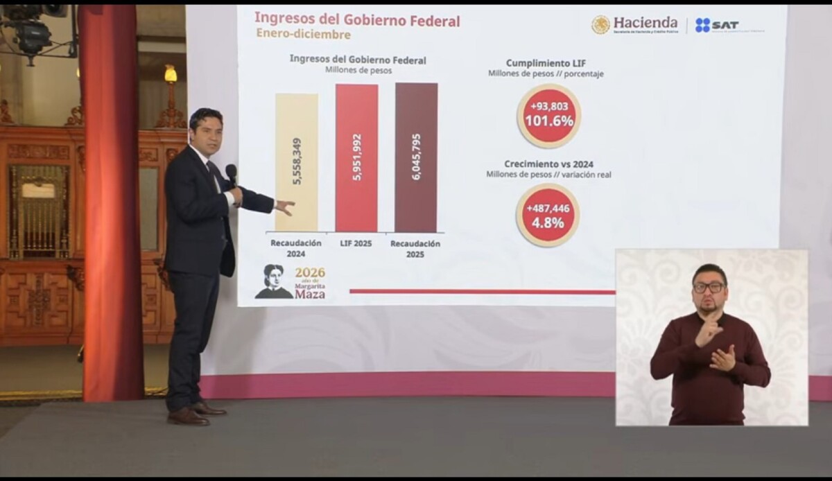 En tanto, el titular de la Secretaría de Hacienda y Crédito Público, Édgar Amador, informó que para 2026 el SAT prevé recaudar 6,44,301 millones de pesos, lo que supone 496,309 millones más que en 2025, equivalente a un aumento de 4.6%.