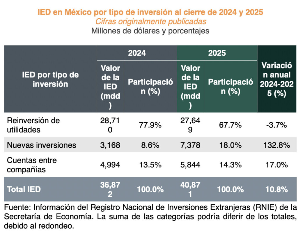 De acuerdo con la Secretaría de Economía, el crecimiento de 10.8 por ciento mantiene una tendencia creciente por quinto año consecutivo. Además de que México se posiciona como un destino estratégico para el capital productivo global, frente a un entorno en el que los flujos de IED hacia las economías en desarrollo mostraron una caída del 2 por ciento en 2025, de acuerdo con estimaciones de la ONU Comercio y Desarrollo (UNCTAD).