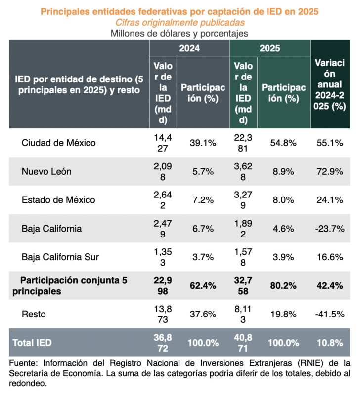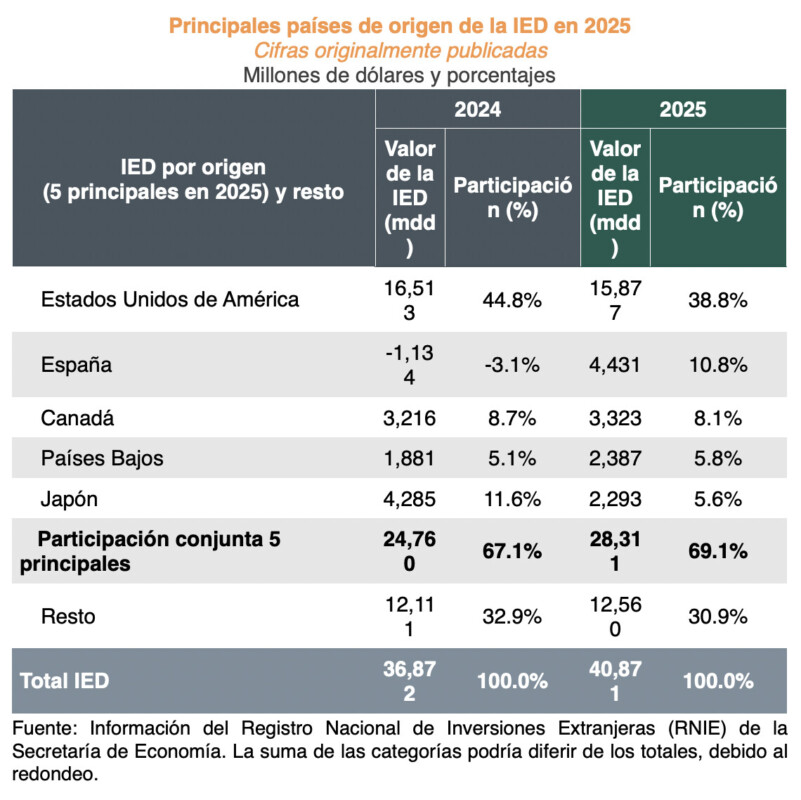 La Presidenta Claudia Sheinbaum Pardo resaltó que México alcanzó una cifra histórica de Inversión Extranjera Directa (IED) en 2025 al recibir 40 mil 871 millones de dólares, lo que representa un crecimiento de 10.8 por ciento respecto a 2024, la cifra más alta registrada en un ejercicio anual, lo que refleja que México va bien, la confianza en el país y que el modelo económico de la Cuarta Transformación da resultados.
