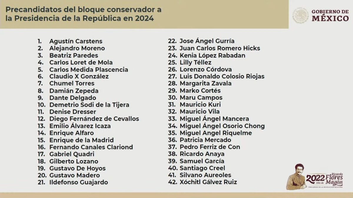 Bajo la premisa que “ya no hay tapados”, el presidente Andrés Manuel López Obrador presentó esta mañana un listado con 43 nombres de quienes podrían competir por la candidatura presidencial del “sector conservador” para las elecciones de 2024.