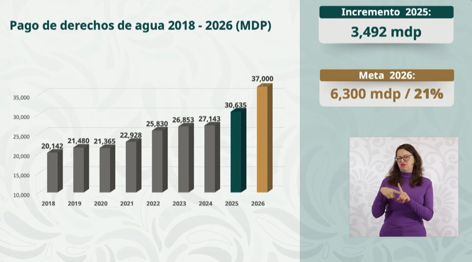 En términos de resultados, Morales destacó un incremento en la recaudación de 3,500 millones de pesos durante 2025, con una meta de 6,300 millones para 2026. Estos recursos serán destinados a obras hidráulicas y proyectos para ampliar el acceso al agua.