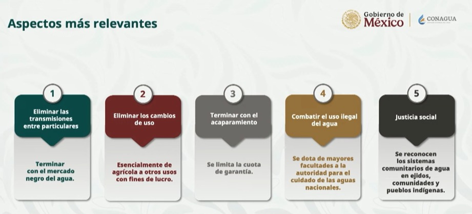 Uno de los cambios más relevantes es la eliminación de las transmisiones de concesiones, mecanismo que permitió la creación de un mercado paralelo del agua. “La nueva ley elimina las transmisiones entre particulares, lo que permite terminar con el mercado negro del agua”, explicó el funcionario.