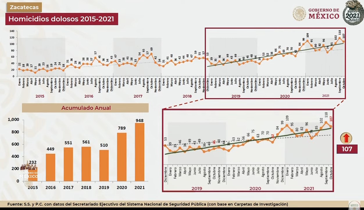 Al anunciar el reforzamiento de operativos con fuerzas federales en Zacatecas, por tierra y aire, el general secretario, Luis Crescencio Sandoval informó que en los tres años recientes, los homicidios vinculados a la delincuencia organizada se multiplicaron en la entidad, y la perspectiva es el aumento en esta tendencia violenta.