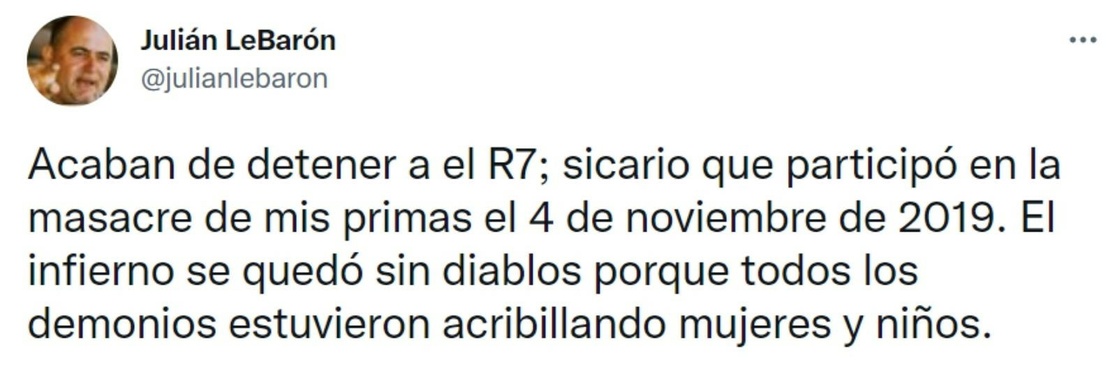 El activista Julián LeBarón informó a través de su cuenta de Twitter “acaban de detener a el R7; sicario que participó en la masacre de mis primas el 4 de noviembre de 2019. El inferno se quedó sin diablos porque todos los diablos porque todos los demonios estaban acribillando mujeres y niños”.
