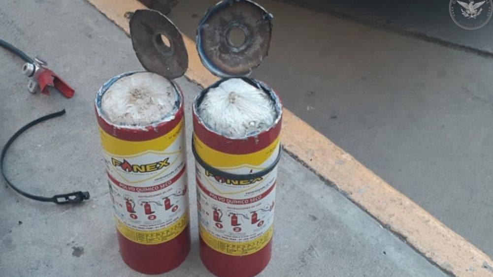 Detienen a sujeto por transportar metanfetamina en extintores. Decomisan los elementos de la Guardia Nacional aproximadamente 10 kilos 500 gramos de metanfetamina en extintores de fuego, los cuales eran transportados en un vehículo que circulaba por la carretera Chihuahua-Ciudad Juárez.