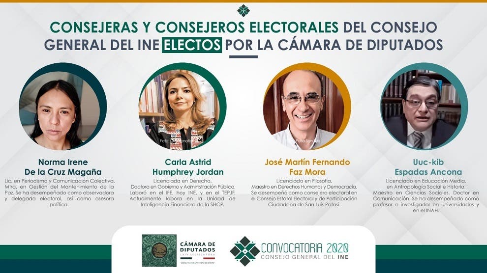 Con cubrebocas, caretas y sana distancia, la Cámara de Diputados aprobó por mayoría calificada, con 399 votos a favor, 5 en contra y 5 abstenciones, el acuerdo de la Junta de Coordinación Política por el que se eligieron a Norma de la Cruz Magaña, Carla Humphrey Jordán, José Martín Fernando Faz Mora y Uuc-Kib Espadas Ancona, para formar parte del árbitro electoral.