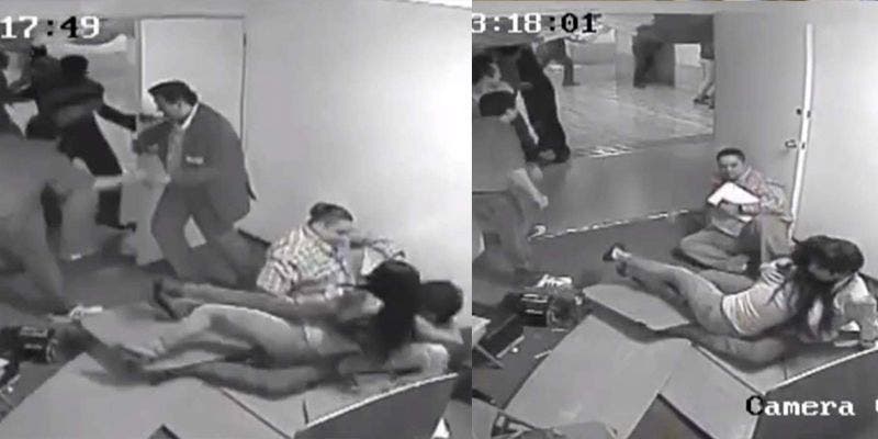 Las imágenes fueron grabadas por una cámara de seguridad, en ellas se observa como al menos siete personas intentan salir de una oficina de una manera desesperada, pero, debido a la fuerza del sismo, pierden el control y caen al piso.