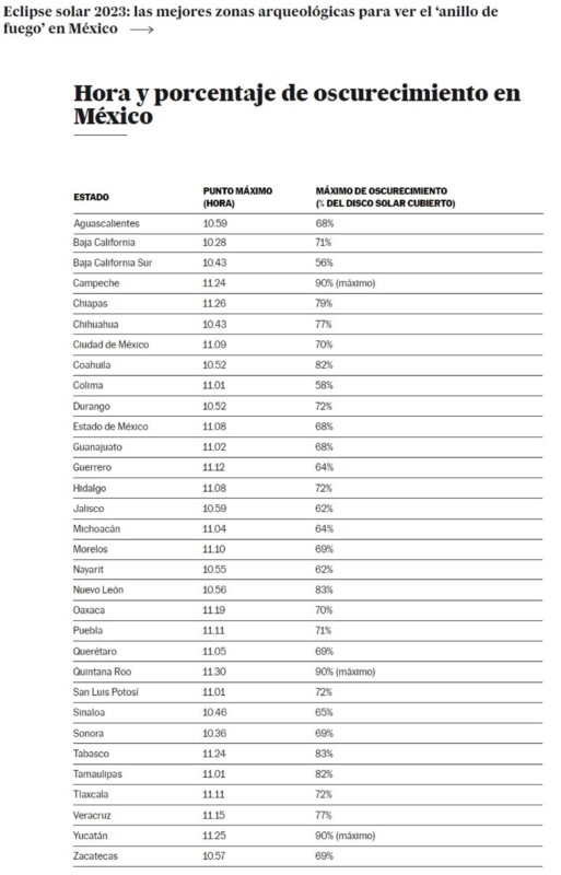 El ‘anillo de fuego’ será visible en la península de Yucatán, en una franja que atravesará el sur de Quintana Roo, el sur de Yucatán y el norte de Campeche. Entre los mejores sitios para ver la anularidad, que alcanzará una duración máxima de cuatro minutos y medio, estarán la ciudad de Campeche y Champotón (Campeche); los puertos de Celestún y Sisal, la zona arqueológica de Uxmal (Yucatán); además de Chetumal y Bacalar (Quintana Roo).
