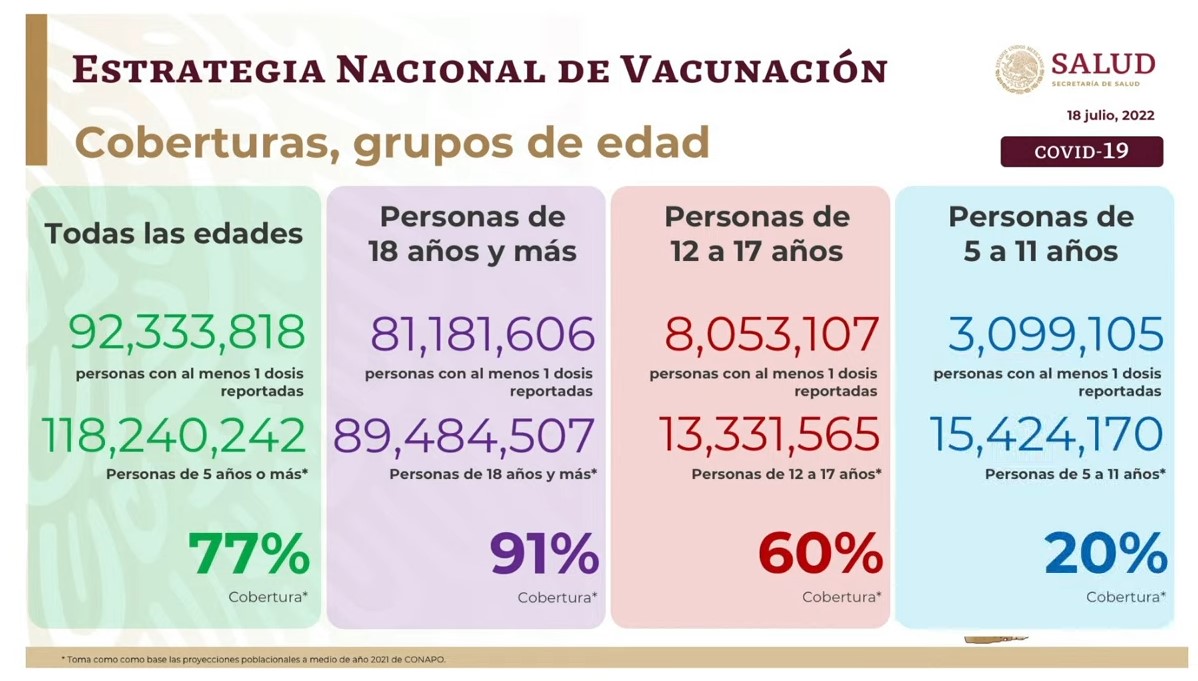 Asimismo, la cobertura en mayores de 18 años es de 91 por ciento, que equivale a 81 millones 181 mil 606 personas con al menos una dosis; mientras que, en el grupo poblacional de 12 a 17 años, el avance es de 60 por ciento, con ocho millones 053 mil 107 adolescentes.