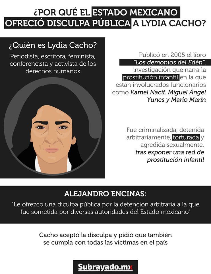 El pasado 10 de enero, el Gobierno de México ofreció disculpas a la periodista por la tortura de la que fue víctima. “Estamos aquí siendo consecuentes como gobierno con nuestra historia, con las omisiones y errores del pasado, estamos aquí para ofrecer disculpas a nombre del Estado mexicano a Lydia Cacho”, dijo la Secretaria de Gobernación del país, Olga Sánchez Cordero.