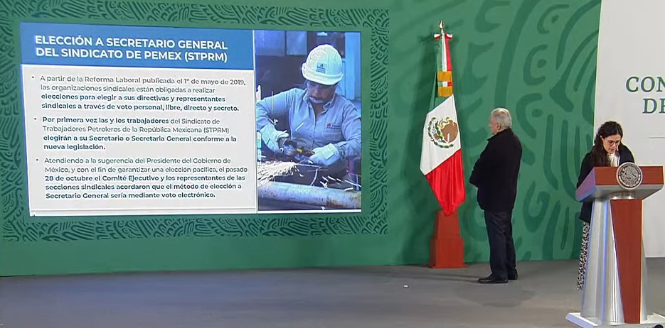 “Las y los trabajadores del sindicato de trabajadores petrolero de la República Mexicana van a elegir a su representante general conforme a esta nueva legislación, atendiendo la sugerencia del Presidente [Andrés Manuel López Obrador] y con el fin de garantizar elecciones pacíficas que cumplan con los principios democráticos”.