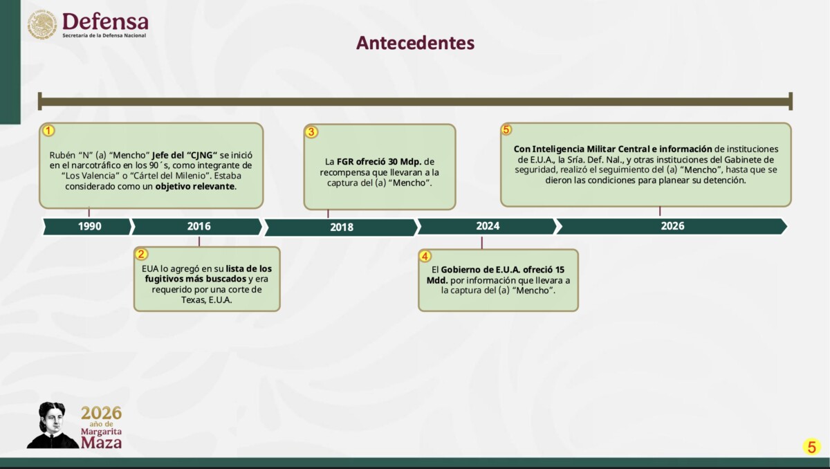 Durante la Mañanera del Pueblo señaló que, mediante inteligencia militar central e información complementaria de las instituciones del Gabinete de Seguridad y de agencias estadounidenses, la Secretaría de la Defensa Nacional dio seguimiento a la red de vínculos del líder criminal hasta generar las condiciones para planear su detención.