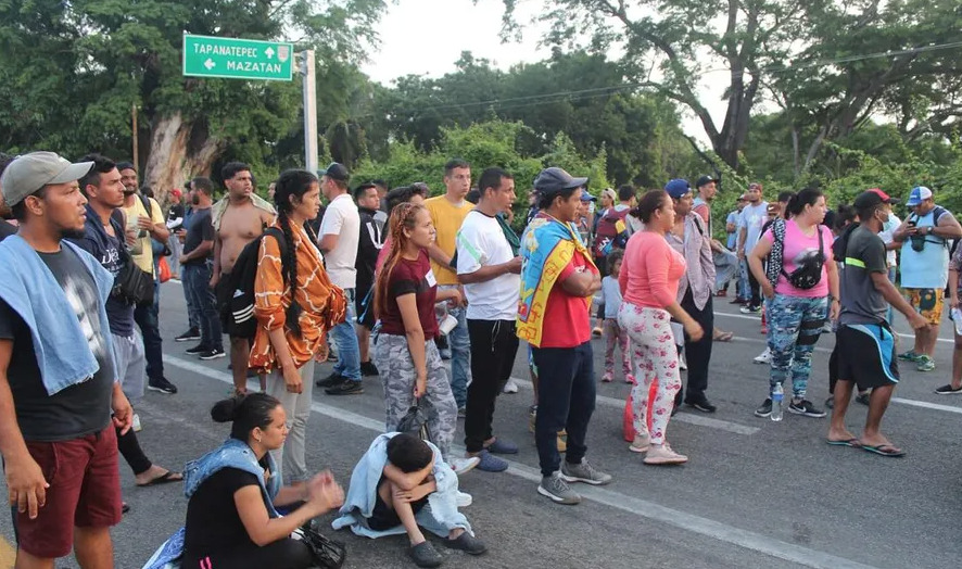 La interrupción de la circulación en esta carretera federal, permanece desde hace 48 horas; originado por el numerosas personas migrantes de diversos países de Centroamérica, Sudamérica, el Caribe y hasta de África.