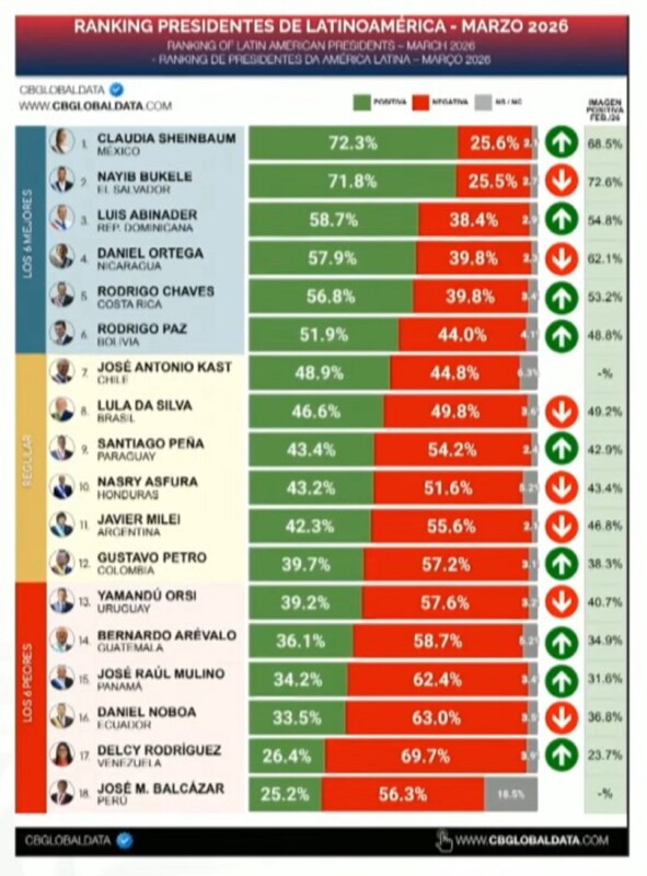 Mientras que en el otro extremo del ranking, los presidentes con menor nivel de aprobación son José María Balcázar, presidente de Perú, quien se posiciona en el último lugar con 25.2% de imagen positiva; seguido por Delcy Rodríguez, presidenta de Venezuela, con 26.4%; y Daniel Noboa, de Ecuador, con 33.5% de aprobación.