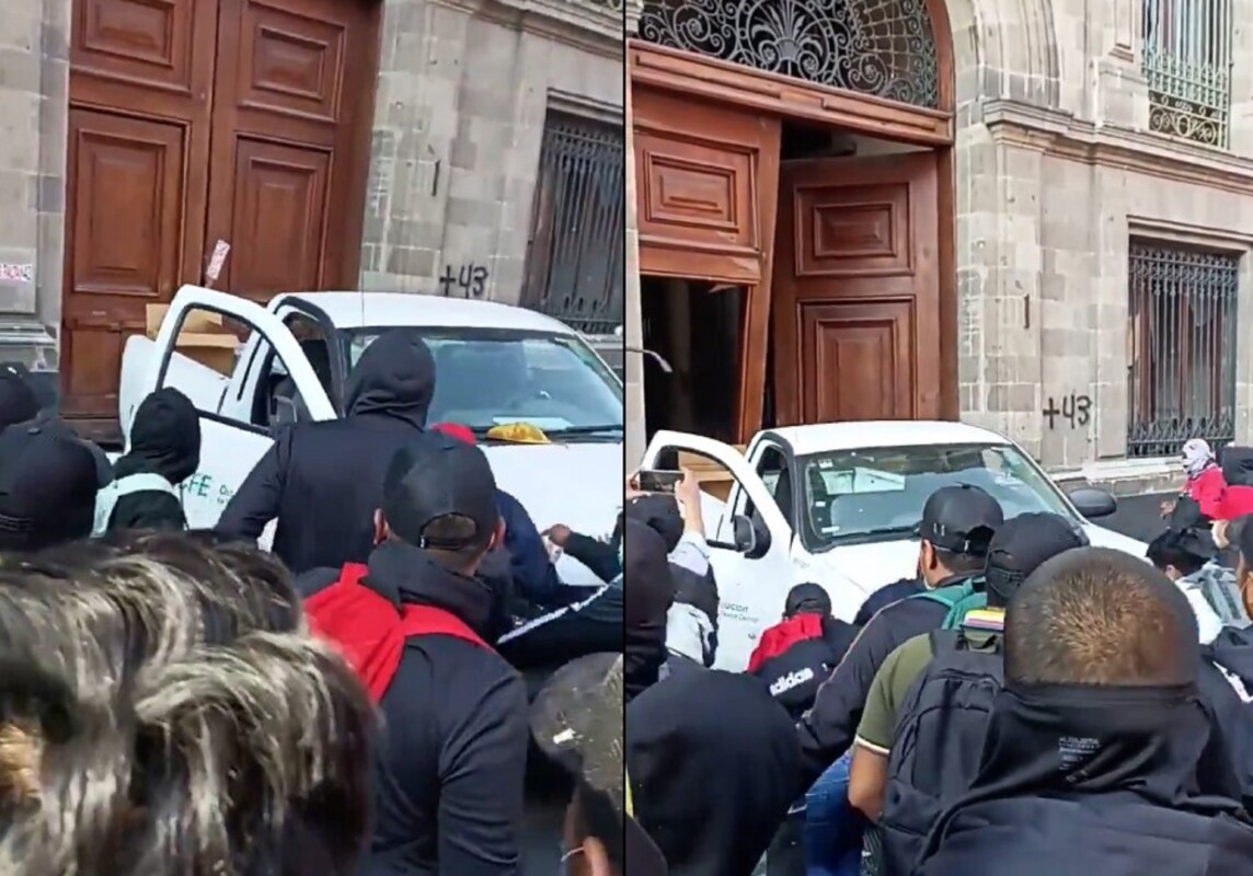 Cuando se desarrollaba la conferencia mañanera, un grupo de presuntos normalistas encapuchados de la Escuela Normal Rural “Raúl Isidro Burgos” de Ayotzinapa derribó la puerta número 1 de Palacio Nacional con una camioneta.