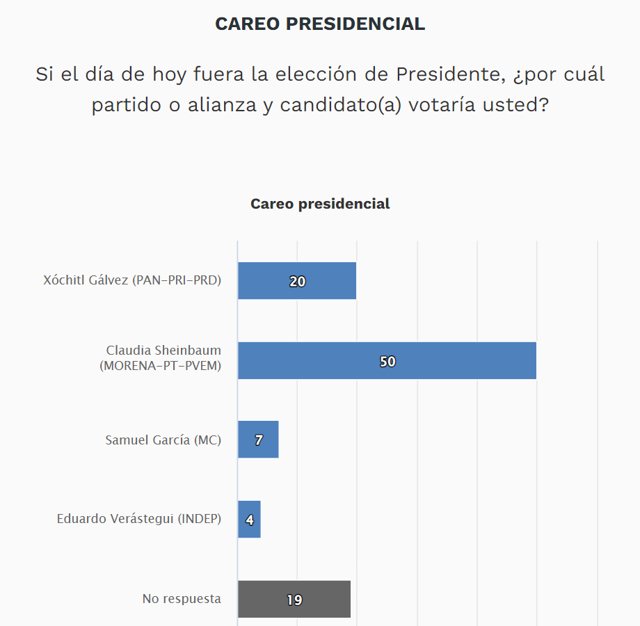 De acuerdo con la encuesta de Buendía & Márquez para El Universal, si hoy fueran las elecciones el 50% de las personas votarían por Claudia Sheinbaum, seguida de Xóchitl Gálvez con el 20% de intención de voto y Samuel García con el 7%.