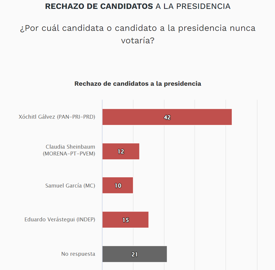 A la pregunta sobre por cuál candidato nunca votarían los ciudadanos, el 42% de los encuestados nunca votarían por Xóchitl Gálvez, seguida de Eduardo Verástegui, aspirante independiente a la candidatura presidencial, con el 15% y Claudia Sheinbaum con el 12%.