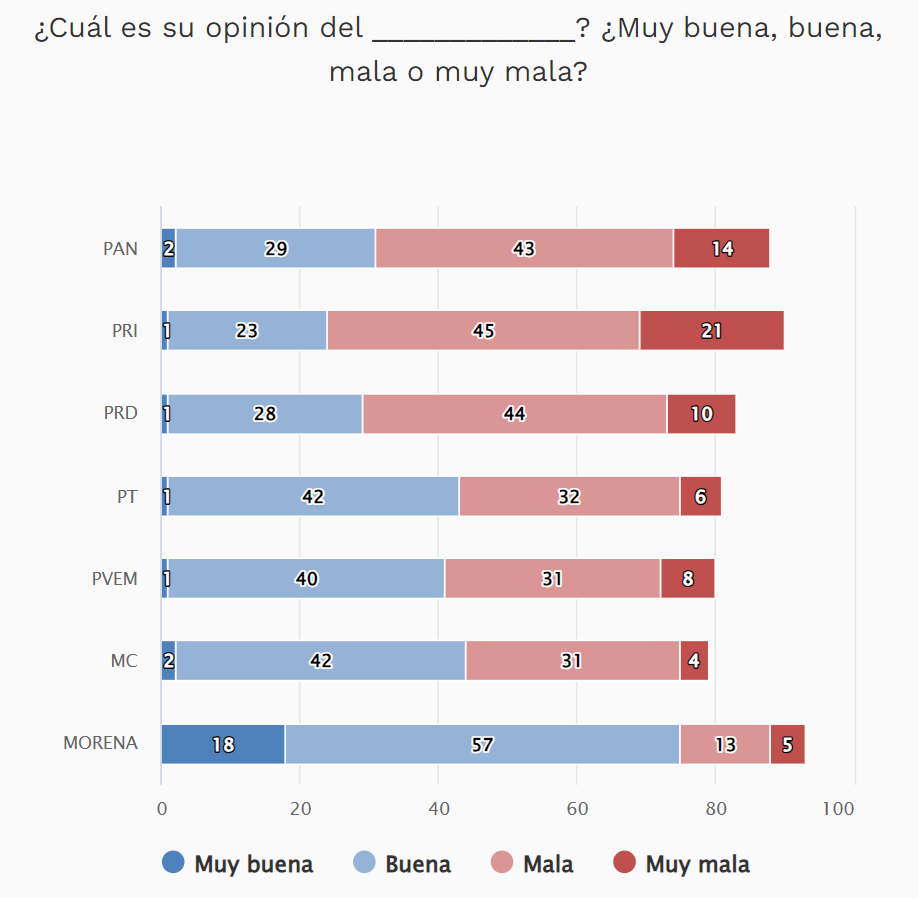 Respecto a las opiniones malas o muy malas la lista es encabezada por Xóchitl Gálvez con 20% de estas opiniones, seguida de Samuel García con 12%, Dante Delgado, Eduardo Verástegui y Claudia Sheinbaum con 11% respectivamente.