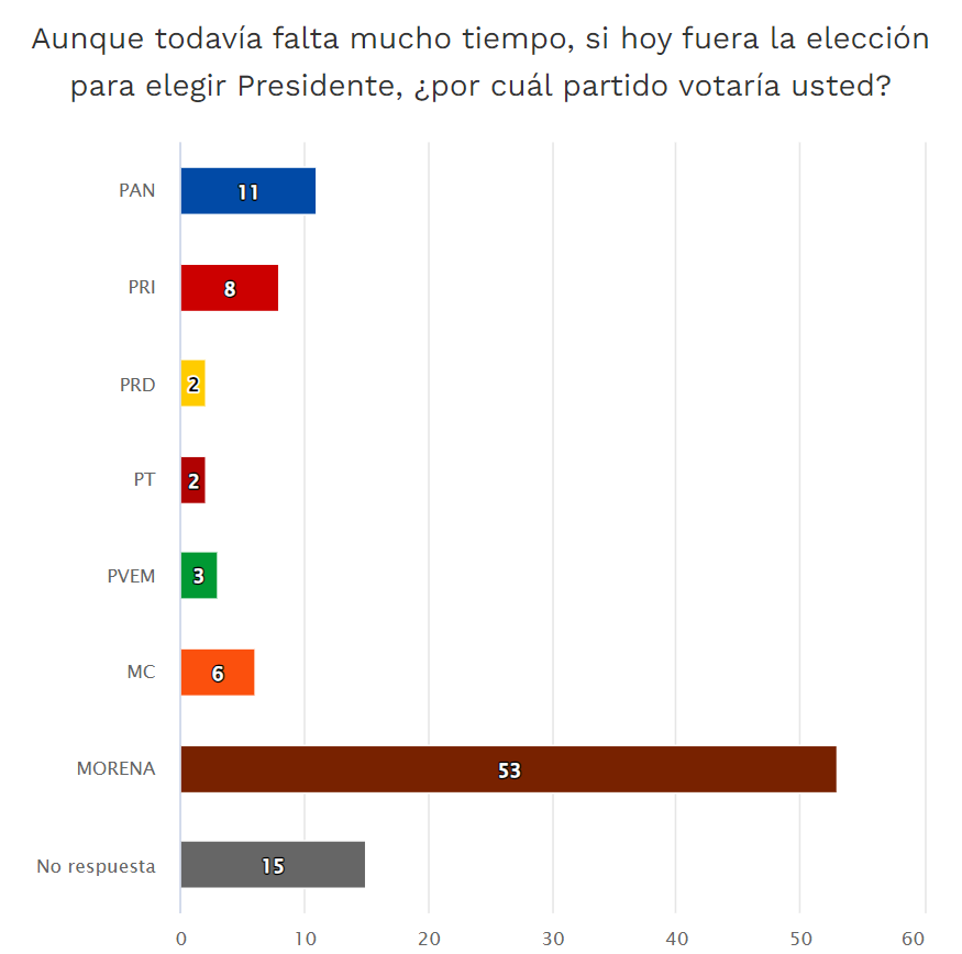 Referente a la preferencia de voto de las personas por partido político si hoy fueran las elecciones, el 53% de los encuestados aseguraron que votarían por Morena, seguido del Partido Acción Nacional con el 11%, el Partido Revolucionario Institucional con el 8% y Movimiento Ciudadano con el 6%.