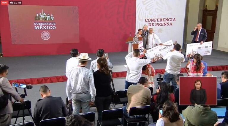 En la conferencia de prensa matutina, el presidente Andrés Manuel López Obrador entregó un cheque por 21 millones 151 mil pesos a Zeferino Villanueva Galindo, presidente municipal de Metlatónoc, y otro por igual cantidad a Edith López Rivera, presidenta de Cochoapa El Grande.