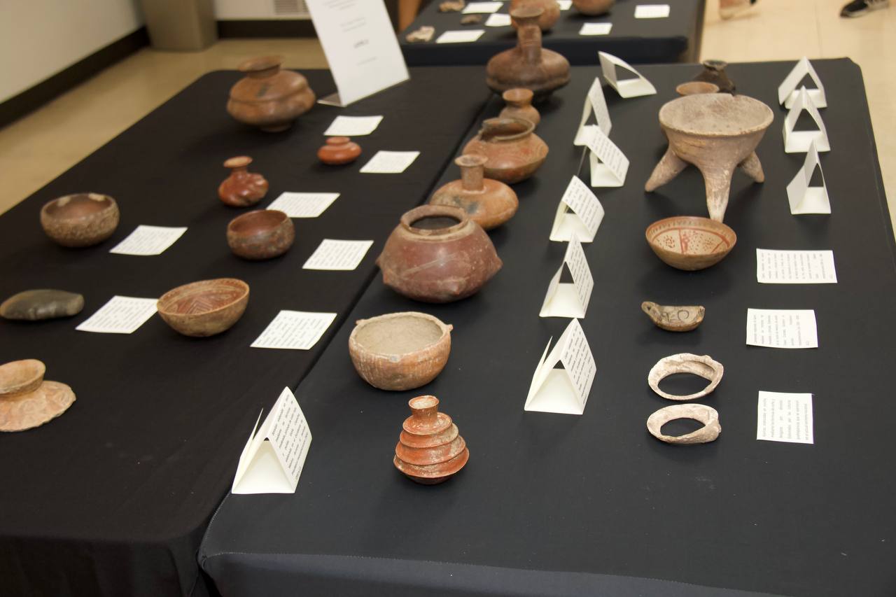 Destacan piezas como un vaso con soporte en forma de pedestal, elaborado en barro con técnicas de modelado y esgrafiado, perteneciente a las culturas de la costa del Golfo, del periodo Clásico mesoamericano de los años 100 a 900 después de Cristo.