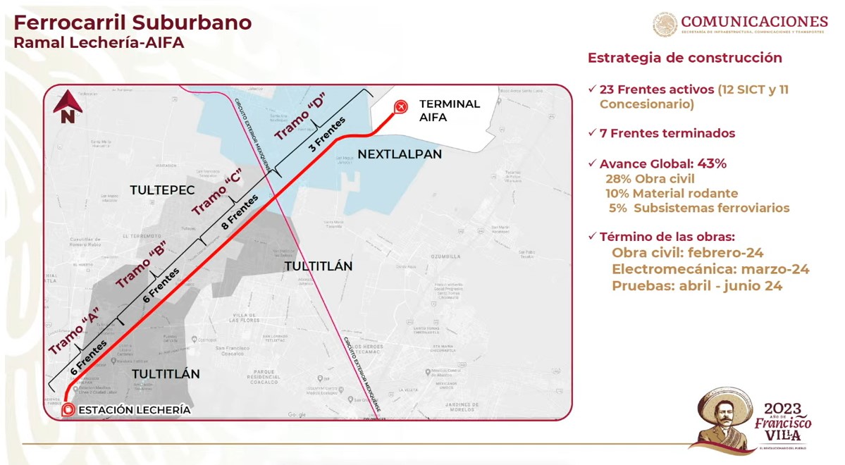 Por su parte, el director general de Desarrollo Ferroviario Multimodal de la SICT, Manuel Gómez Parra dijo que los plazos objetivo de avance en la obra son: febrero de 2024 para concluir la obra civil, viaductos ferroviarios y un distribuidor muy importante en Tultepec; en marzo de 2024 la obra electromecánica y el periodo de pruebas será entre abril y junio.