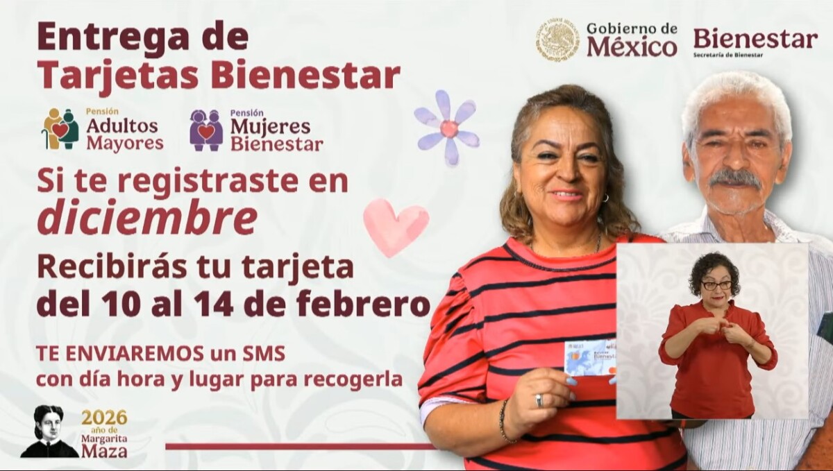 La Secretaría del Bienestar informó que del 10 al 14 de febrero iniciará la entrega de las Tarjetas Bienestar a las personas que se registraron en diciembre en las Pensiones para Adultos Mayores y Mujeres Bienestar. Los beneficiarios recibirán un mensaje SMS con el día y lugar para recoger su tarjeta.