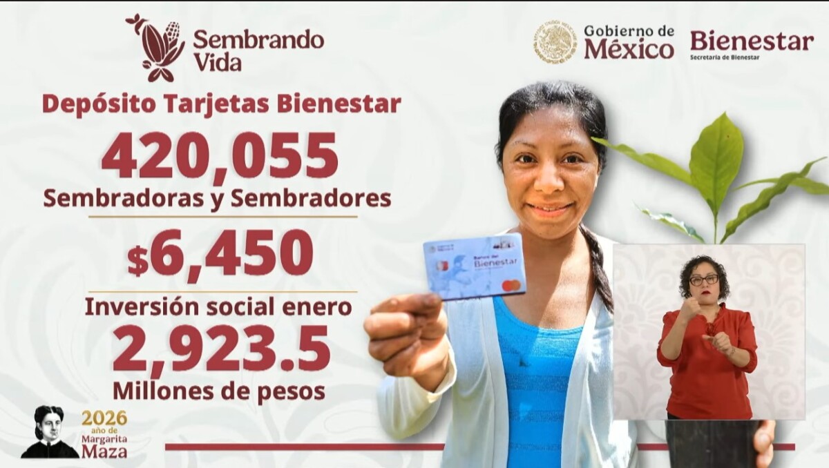 En paralelo, el 10 de febrero se realizará el primer depósito del año del programa Sembrando Vida a 420 mil sembradoras y sembradores, por un monto de 6 mil 450 pesos, con una inversión social de 2 mil 923.5 millones de pesos. Además, con el programa Salud Casa por Casa, al 8 de febrero se han brindado 10.7 millones de consultas médicas a adultos mayores y personas con discapacidad.