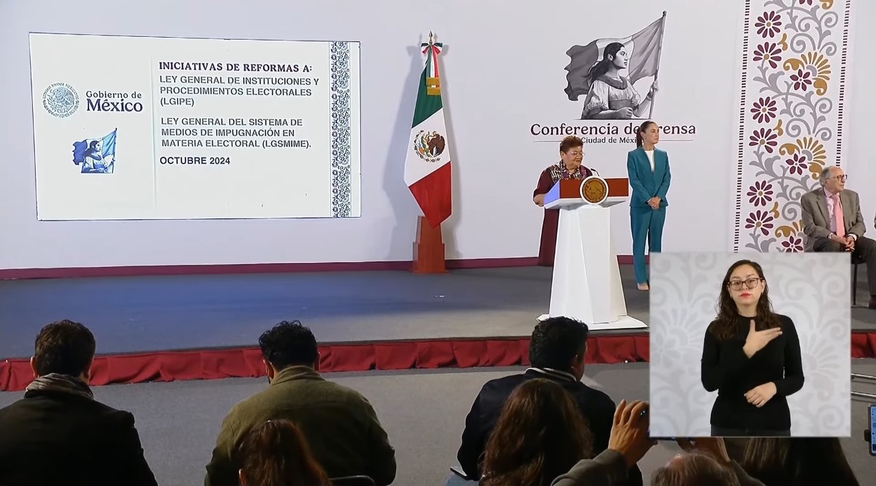 La consejera jurídica de Presidencia, Ernestina Godoy, dio a conocer el contenido de las leyes secundarias que se enviarán al Senado referentes a la elección de jueces, magistrados y ministros que se llevará a cabo el 1 de junio de 2025, para implementar la reforma al Poder Judicial.