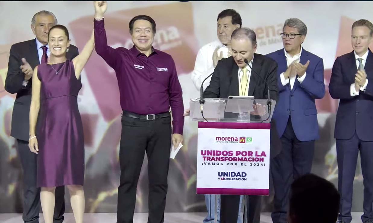 Desde el World Trade Center (WTC) de la Ciudad de México, Delgado dijo que su consuma un proceso pacífico y bajo la consigna de que el pueblo pone y el pueblo quita. Además de que el movimiento está por encima de cualquier proyecto personal, previo a alzar la mano a Sheinbaum Pardo ante la emoción de sus partidarios que gritaban a su vez «presidenta, presidenta».
