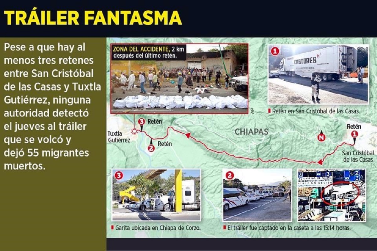 Asimismo, de acuerdo a una investigación del periódico Reforma, aseguran que el tráiler que se volcó el jueves con más de 160 migrantes en Chiapas cruzó por al menos tres puntos de revisión de autoridades policiales sobre la carretera San Cristóbal de las Casas-Tuxtla Gutiérrez y nadie lo detuvo para su revisión.