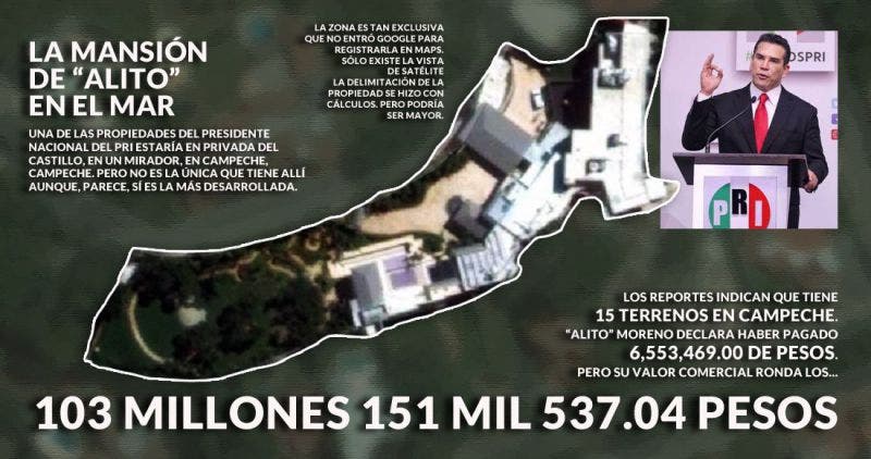 En la denuncia, Ulises Ruiz citó un reportaje del periódico Reforma del 8 de julio de este año, donde se evidenció que “Alito” Moreno al parecer posee una mansión de 46 millones de pesos en el estado que gobernó, Campeche, la cual discrepa con la declaración de sus bienes. La información detallaba que el inmueble fue construido durante dos años en los que el ex mandatario local declaró ingresos anuales por 5 millones de pesos.