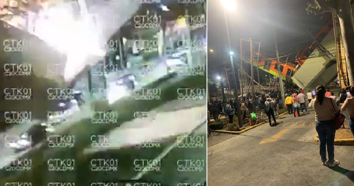 En un vídeo de las cámaras del sistema de vigilancia del Gobierno de la Ciudad de México se observa cómo la estructura elevada se rompe al paso del tren que se desploma, desde una altura de unos 20 metros, y dos vagones del convoy quedan en “V” e impactados con el piso.