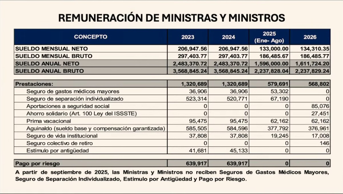 Además, señaló que, a partir de septiembre de 2025, las y los ministros no reciben Seguros de Gastos Médicos Mayores, Seguro de Separación Individualizado, Estímulo por Antigüedad o Pago por Riesgo.