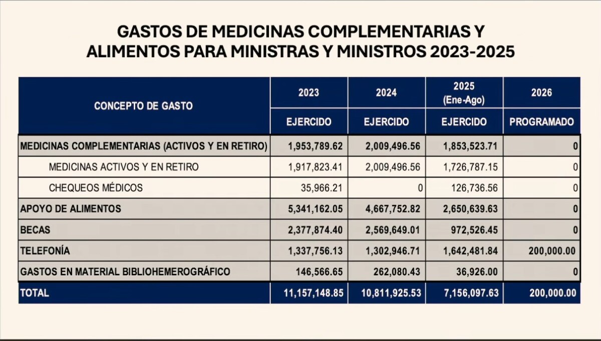 De igual forma, señaló que quienes integraban el máximo tribunal de justicia del país, entre 2023 y 2025, recibían extras para medicinas complementarias, chequeos medios, apoyo de alimentos, becas, telefonía y gastos en material bibliohemerográfico, que daban un total de 11.1 millones de pesos.